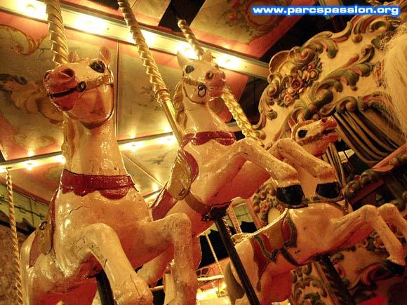 Contre-plongée sur les chevaux d'un manège / Ce superbe carrousel de chevaux de bois date de 1900.