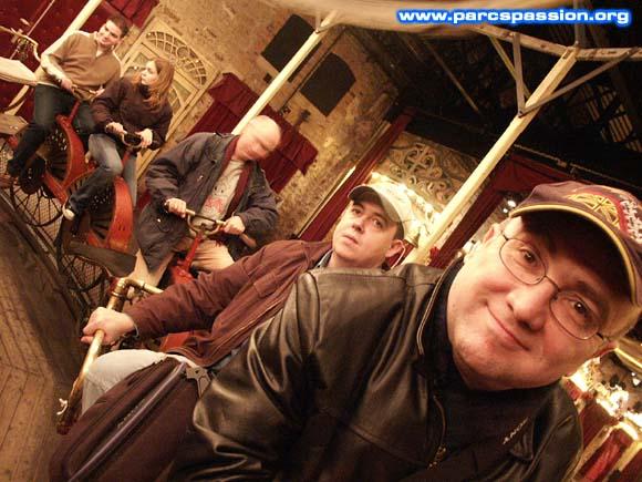 Le groupe prend place sur le manège de vélocipèdes / Allez, tout le monde en selle !