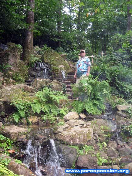 Le 08/07/2006 Daniel devant une petite cascade dans une forêt luxuriante / Le Grand Parc du Puy du Fou dispose également d'une superbe forêt qui invite à la douce rêverie. |