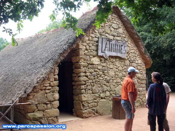 Un bâtiment en pierre avec un panneau en bois "Latrines" / Ici, les toilettes s'appellent latrines !