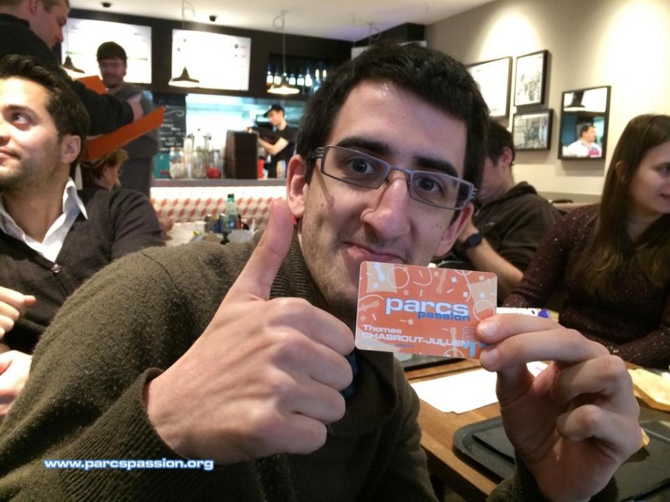 Le 29/01/2017 Distribution des cartes de membre 2017, au graphisme entièrement revu pour cette nouvelle saison. Thomas, nouvel adhérent, est très ému de devenir officiellement membre de Parcs Passion :-) |