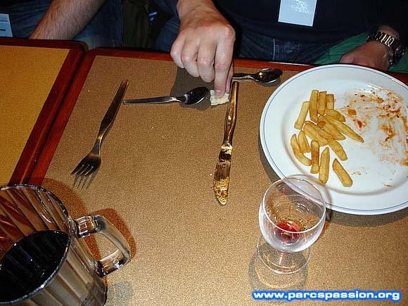 Le 12/05/2007 Du pain et des couverts pour expliquer la Tour de la Terreur / Eric : "Alors là tu vois, c'est ce qui fait toute la différence entre la version Californie et la version Floride." |