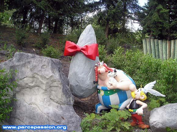 Obélix porte un menhir et Idéfix devant Astérix / Merci Astérix et à la prochaine !