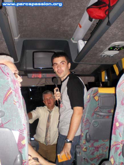Nicolas parle au micro dans le bus / "Bon les enfants... On va arriver à Calais alors préparez-vous !"