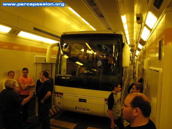 Le groupe dans le shuttle devant le bus / Sous la Manche, les discussions continuent et Alton Towers se rapproche.