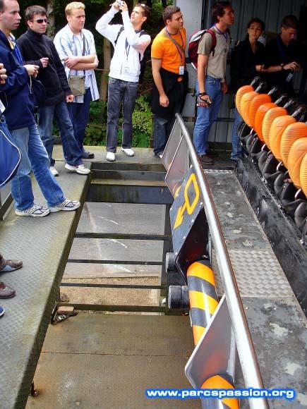 Le groupe devant un train d'Oblivion / La visite commence par le garage d'Oblivion.