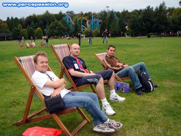 Le 15/09/2007 Cyril, Grégory et Aurélien devant Spinball Whizzer / "Notre secret pour être d'attaque dès le matin ? La chaise longue ! Oui mais... au pied de Spinball Whizzer (sinon ça marche pas) !" |