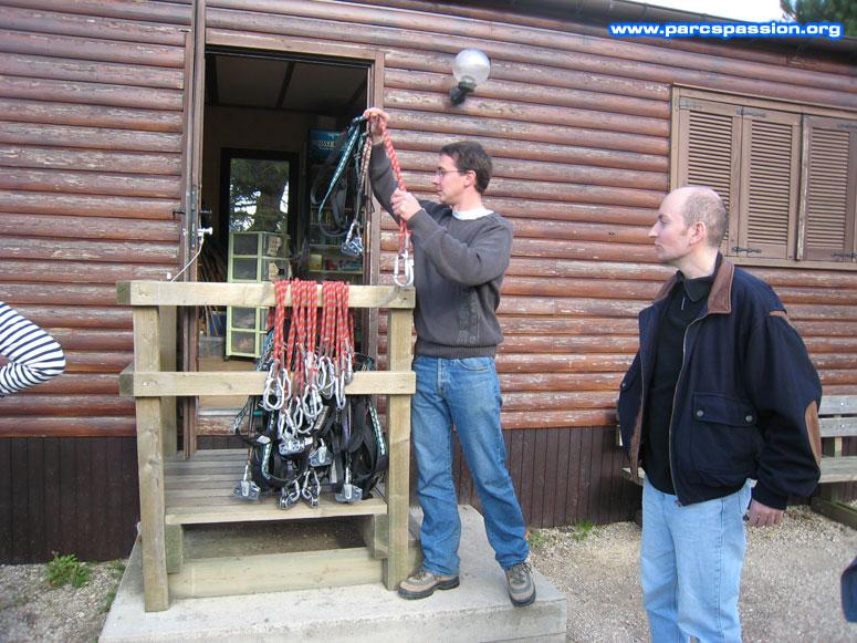 Le 18/10/2008 Ludovic s'équipe pour l'accrobranche au Ranch Davy Crockett / Après avoir pris possession des bungalows, Ludovic est le premier à s'équiper pour l'accrobranche. |