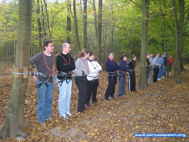 le groupe dans la forêt pour l'accrobranche / Première leçon pour le groupe.