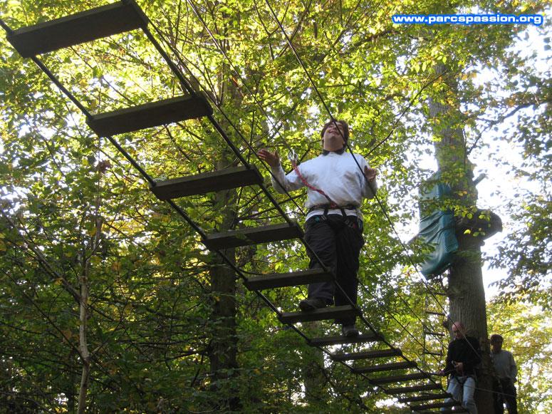 Lilian sur un pont à l'accrobranche du Ranch Davy Crockett / "Fastoche, y'a qu'à marcher sur les planches."