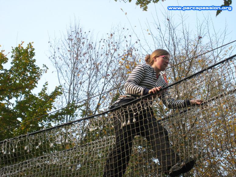 Domitille sur un pont de singe de l'accrobranche du Ranch Disney / Domitille est hyper concentrée sur le pont singe.