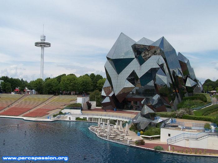 Le 31/05/2008 Le pavillon Kinemax derrière le lac avec la Gyrotour à gauche / Ici, c'est le Kinemax, un autre pavillon symbole du Futuroscope. On y trouve un système de projection IMAX sur un écran plat de 600 mètres carrés. |