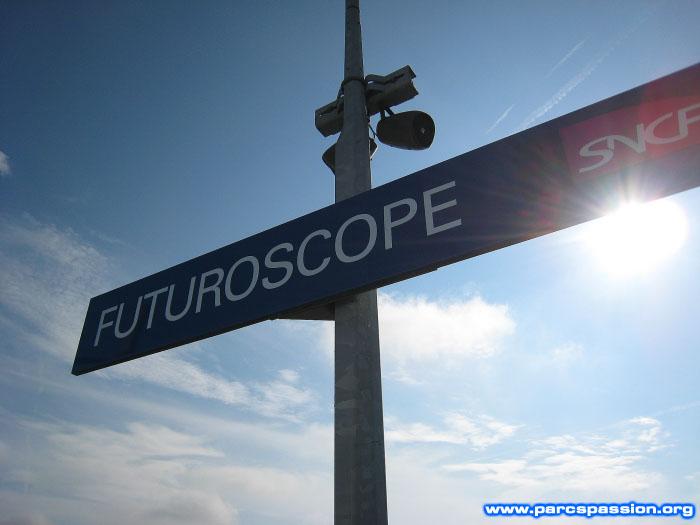 Panneau de la gare du Futuroscope / "Gare du Futuroscope 2 minutes d'arrêt !"
