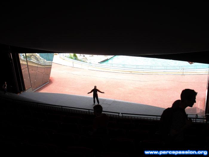 Le 31/05/2008 L'écran du Kinemax se lève au dessus de notre guide Brigitte / Non, les vérins qui soulèvent l'écran du Kinemax ne sont pas en panne. Merci Brigitte de les avoir remis en route pour nous ! C'était magique... |