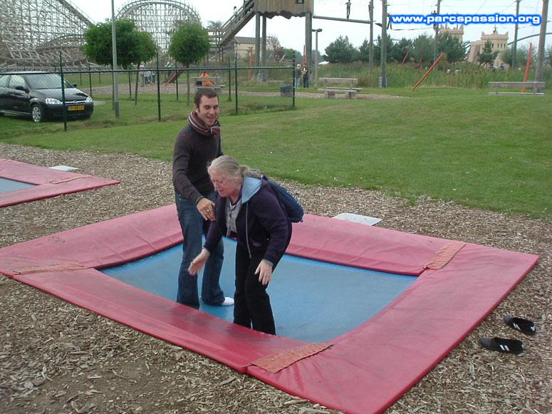 Le 19/09/2008 Mathieu et Micheline sur le trampoline de Toverland / "Oui, comme ça Micheline, ramènes bien les genoux vers toi pour le salto arrière." |