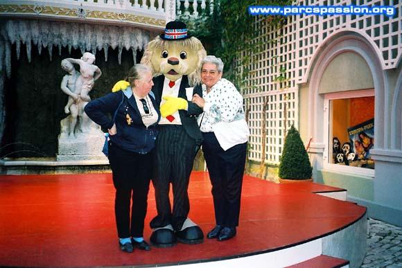 Le 27/09/2003 Micheline et Marie Claude avec un personnage du parc / "Hello ladies, would you like to take a cup of tea ?" |