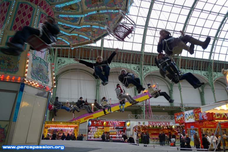 Manège de chaises volantes en action / Une fois le métier en rotation, le vent froid rend le tour glacial !