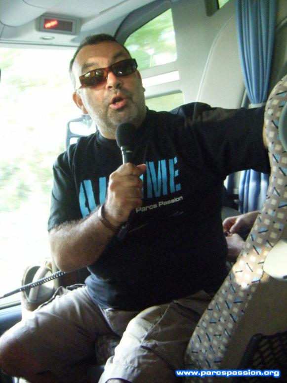 Le 24/08/2009 Christophe au micro dans le bus du Super AIRTIME 2009 / Dans le bus, Christophe prend la parole avant l'arrivée à Gardaland. |