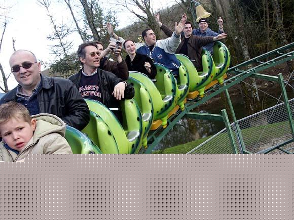 A bord de la Chenille dans un virage / Contrairement au reste du train qui s'amuse, le petit garçon ne semble pas rassuré.