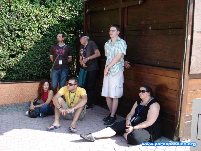 Groupe assis par terre à l'ombre / Certains trouvent un coin d'ombre pour patienter.