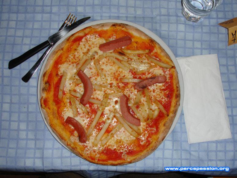 Le 24/08/2009 Une pizza garnie de frites et saucisses / Une pizza avec frites et saucisses. Etonnante composition ! |