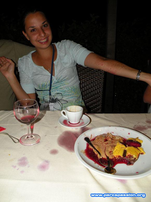 Le 24/08/2009 Parcs Passion repas italien / Attention Armelle, l'abus d'alcool est dangeureux... pour les vêtements ! Ca tache ! |