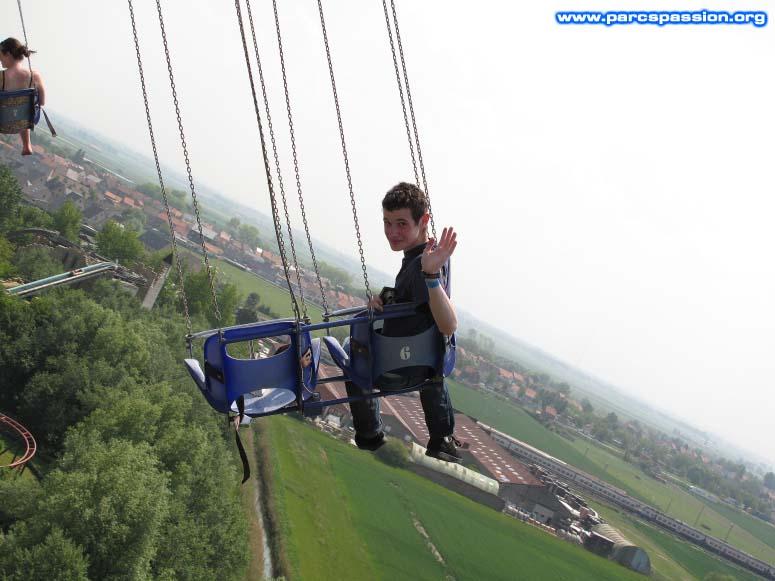 Le 05/06/2010 Jules sur le SpringFlyer / Effectivement, mieux vaut ne pas avoir le vertige et donner toute sa confiance aux chaînes et au bout de plastique qui fait office de chaise... |
