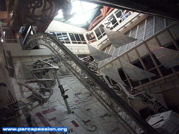 Le 18/01/2004 Le rail de La Navette domine l'espace central du parc / Des navettes de 6 places devaient remonter en 14 secondes le rail pour amener les visiteurs au sommet du parc. |