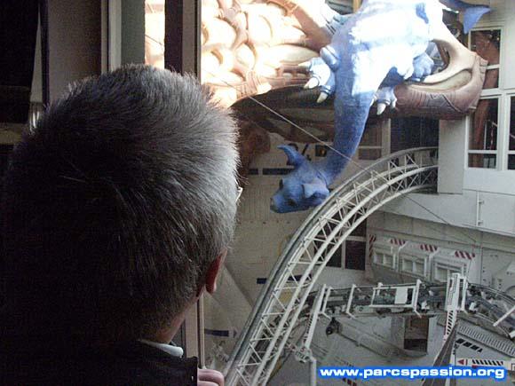 Le 18/01/2004 Yves regarde le dragon bleu qui domine Planète Magique / Un emblématique dragon bleu domine l'immense espace central de Planète Magique. |